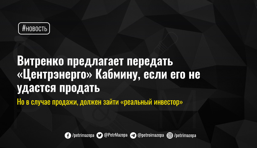 И.о. министра энергетики Юрий Витренко сообщил, что, если с приватизацией ПАО «Центрэнерго» у ФГИ ничего не выйдет, что компанию необходимо передать в управление Минэнерго или Кабмина.