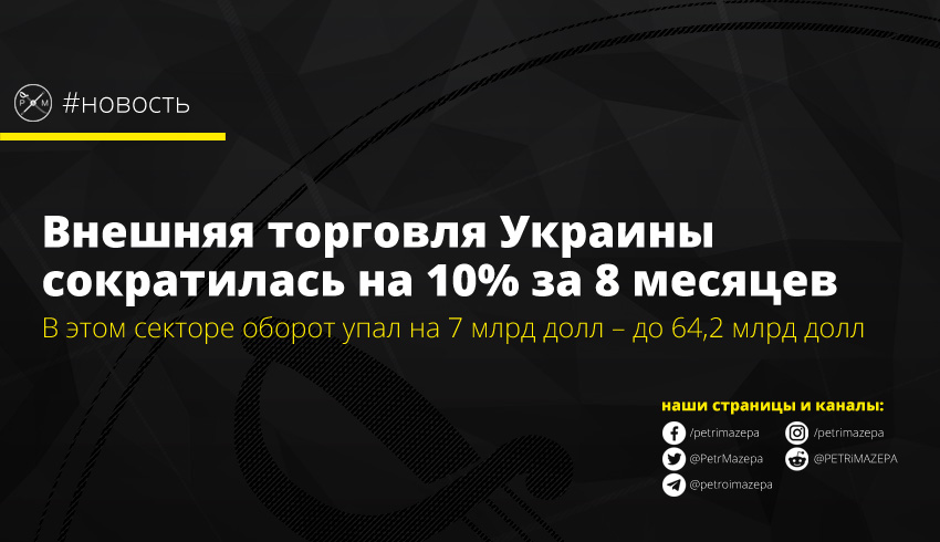 За восемь месяцев 2020 года товарооборот Украины составил 64,2 млрд долл. Это на 9,7% или 7 млрд долл меньше, чем за восемь месяцев 2019 года (71,5 млрд долл).
