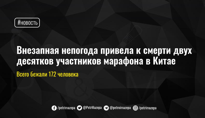 Из-за экстремальных погодных условий на северо-востоке Китая погиб 21 участник 100-километрового горного марафона. В местности, где проводились соревнования, внезапно начались ледяные дожди с градом и штормовой ветер.