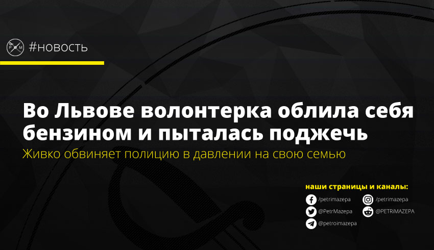 Львовская волонтерка Елена Живко сегодня облила себя бензином просто посреди улицы, но ей не дали себя поджечь, сообщает «Варта-1». По заявлениям самой волонтерки, ее поступок был спровоцирован давлением со стороны полиции на нее и ее семью, а своим поступком она хотела привлечь внимание к делу своего брата.
