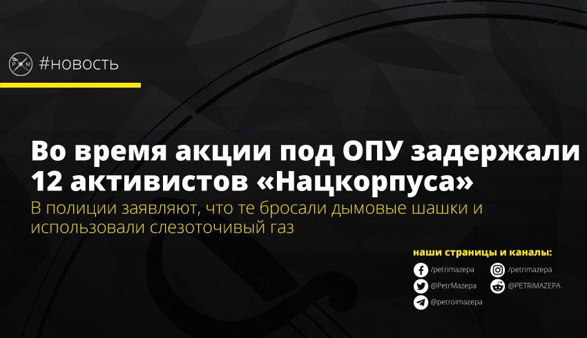 Во время акции под Офисом президента Украины было задержано 12 активистов «Национального корпуса». По данным Нацполиции, задержанные использовали дымовые шашки и слезоточивый газ. Сейчас их доставляют в отделение полиции, где призывает собираться и «Нацкорпус», чтобы «вызволить своих».