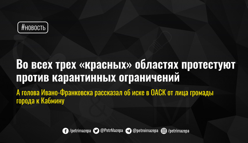 По состоянию на 3 марта в Украине в «красную» зону, где действуют наиболее жесткие ограничения, попали Житомирская, Черновицкая и Ивано-Франковская области. И во всех трех областях предприниматели протестуют против закрытия их бизнеса (ведь при местных локдаунах никакой компенсации не предусмотрено).