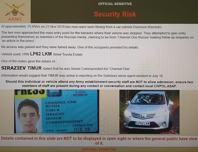 Камеры наблюдения зафиксировали двух россиян, корреспондента Тимура Сиразиева и оператора Дмитрия Волкова около секретной базы 77 бригады в лесу Беркшира. Они вели съемки из автомобиля, подъезжали очень близко к ограждению, пытались проникнуть на базу, а их авто было замечено и в деревне Эрмитаж, где проживают солдаты и офицеры подразделения. Это случилось еще 21 ноября, а уже на следующий день в эфире «Первого канала» вышел их репортаж, где рассказывалось о «фабрике троллей под Лондоном», где в том числе был продемонстрирован вид секретной базы с высоты птичьего полета. Министр обороны Великобритании Гэвин Уильямсон был проинформирован о происшествии 21 ноября, сообщает Daily Mail.