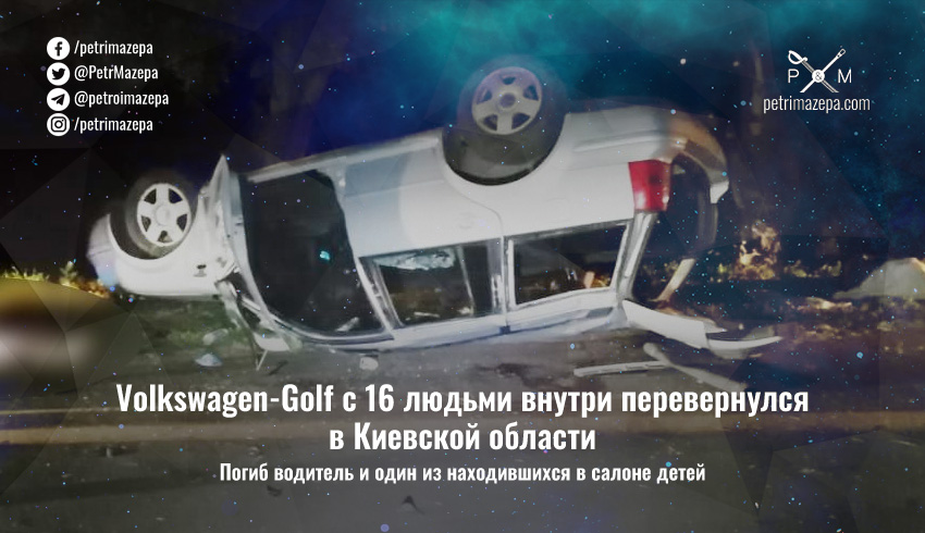 На автодороге Мартусовка-Процев в пределах села Ревне Бориспольского района перевернулся «Vоlkswagen-Golf» в котором было 16 человек, в том числе – семь детей возрасте от 6 до 16 лет. Водитель и семилетний мальчик погибли.