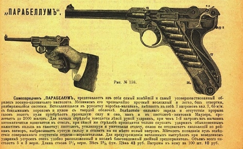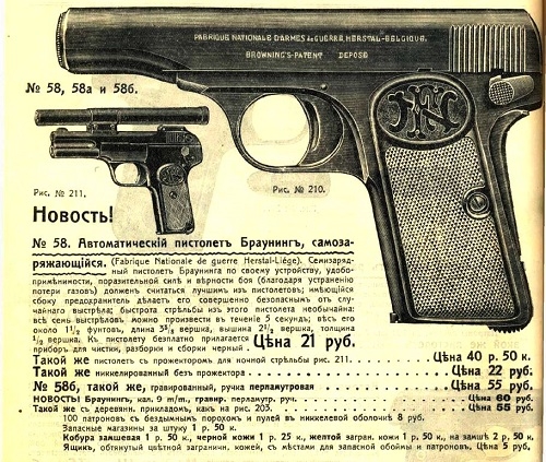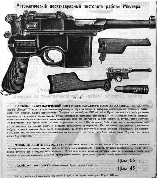 Если сравнивать эти примеры с конкретным уровнем заработка, то 21 рубль (за «Браунинг») — это уровень месячного жалования квалифицированного рабочего или служащего младших чинов. 40–45 рублей (за «Маузер», «Парабеллум» или «Браунинг» с «прожектором») — половина месячного заработка врача или учителя старших классов гимназии. 60 рублей («Винчестер» в базовой комплектации, без глушителя) — чуть ниже жалования подпоручика. При этом за 8 рублей можно было купить деловой костюм, за 15 — длинное пальто, за 40 — патефон.