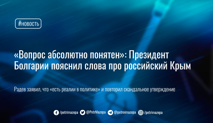 Президент Болгарии Румен Радев повторил свое заявление о том, что оккупированный Крым сейчас принадлежит РФ, хотя и признал, что Россия нарушила международное право, но сослался на «реалии в политике».