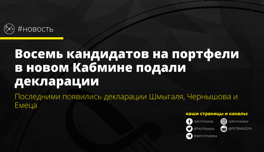 Денис Шмыгаль, Алексей Чернышов и Илья Емец подали электронные декларации об имуществе и доходах за 2019 год как кандидаты на должности министров в новом правительстве Украины. Как и предполагалось – на должности премьер-министра, министра развития громад и территорий, министра здравоохранения соответственно.
