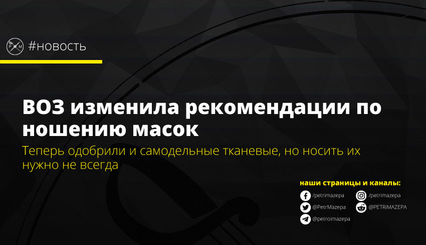 Всемирная организация здравоохранения (ВОЗ) изменила рекомендации по ношению масок – теперь они одобрили самодельные тканевые маски, однако отметили что носить любые маски стоит только медикам, или людям в общественных местах, где затруднено физическое дистанцирование и есть риск передачи COVID-19.