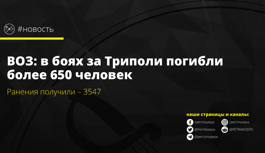 По данным Всемирной организации здравоохранения (ВОЗ) в окрестностях столицы Ливии Триполи, с начала боевых действий в апреле текущего года, погибли 653 человека. В том числе – 41 гражданский.