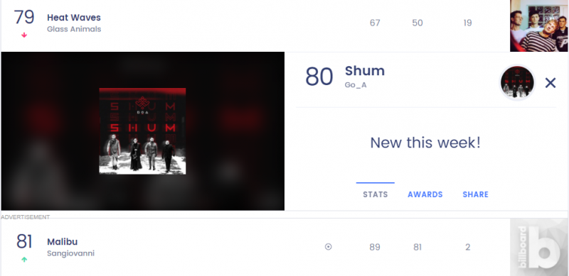 - 22 мая песня «Shum» группы Go_A занимала 5 строчку рейтинга Viral 50 Spotify.