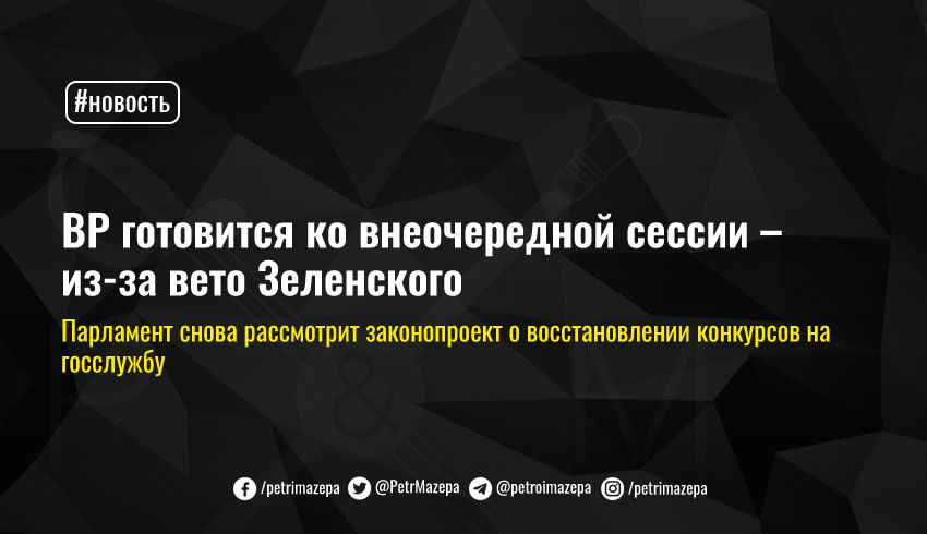 Верховная Рада готовится к проведению внеочередной сессии, на которой планируется рассмотреть ветированный президентом Зеленским законопроект о восстановлении конкурсов на государственную службу.