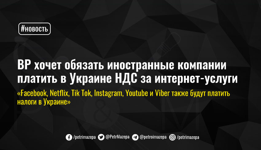 Верховная Рада поддержала в первом чтении законопроект, которым планируется обязать иностранные компании-нерезиденты платить в Украине НДС за предоставление электронных услуг. В «Слуге народа» уже сообщили, что платить налоги могут Facebook, Netflix, Tik Tok, Instagram, Youtube и Viber, а в пояснительной записке авторы законопроекта, также из «Слуги народа», ссылаются в том числе на опыт РФ.
