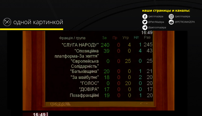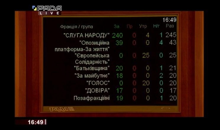 Верховная Рада отправила в отставку правительство Алексея Гончарука. Это значит, что в отставку отправляется все правительство. "За" проголовали 353 народных депутата. Решение встретили аплодисментами. Голоса в поддержку этого решения дали практически все фракции - кроме "ЕС" И "Голоса". Против не проголосовал никто.