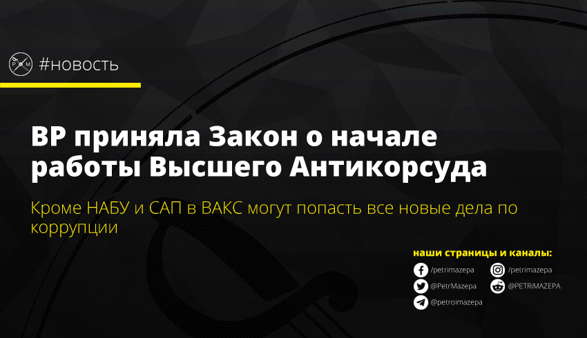 Верховная Рада приняла закон «О внесении изменений к некоторых законодательных актов Украины относительно начала работы Высшего антикоррупционного суда». Подсудность ВАКС следственных судей распространяется на уголовные производства, сведения о которых внесены в Единый реестр досудебных расследований (ЕРДР) со дня начала работы этого суда.