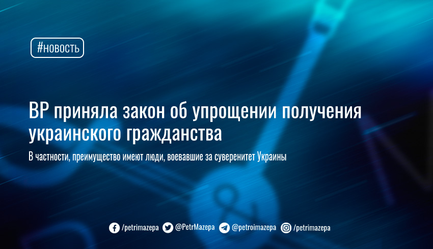 Верховная Рада Украины приняла Закон «О внесении изменений в Закон Украины «О гражданстве Украины» об упрощенном получении гражданства Украины иностранцами и лицами без гражданства, принимавшими участие в защите территориальной целостности и неприкосновенности Украины».