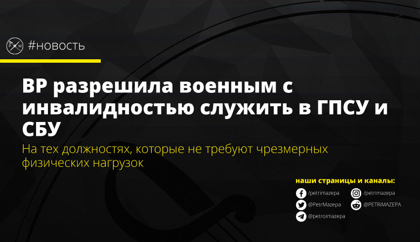 Верховная Рада Украины внесла изменения в закон «Про военную обязанность и военную службу», согласно которым военные ГПСУ и СБУ, признанные непригодными для прохождения службы по состоянию здоровья, смогут продолжить служить на должностях, не требующих чрезмерных физнагрузок.