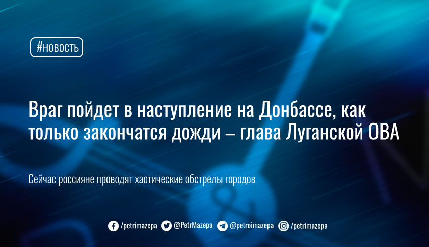 Глава Луганской областной военной администрации Сергей Гайдай сообщил, что сейчас враг усилил обстрелы мирных городов Попасной и Рубежного, а в серьезное наступление на Донецко-Луганском направлении россияне пойдут, как только закончатся дожди.