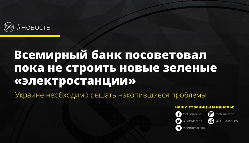Всемирный банк на встрече с и.о. министра Министерства энергетики Ольгой Буславец рекомендовал украинскому правительству отсрочить введение в эксплуатацию новых «зеленых» электростанций.