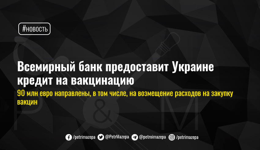 Всемирный банк в рамках глобальной инициативы COVAX утвердил для Украины кредит на сумму 90 миллионов евро для проекта «Экстренное реагирование на COVID-19 и вакцинация в Украине».