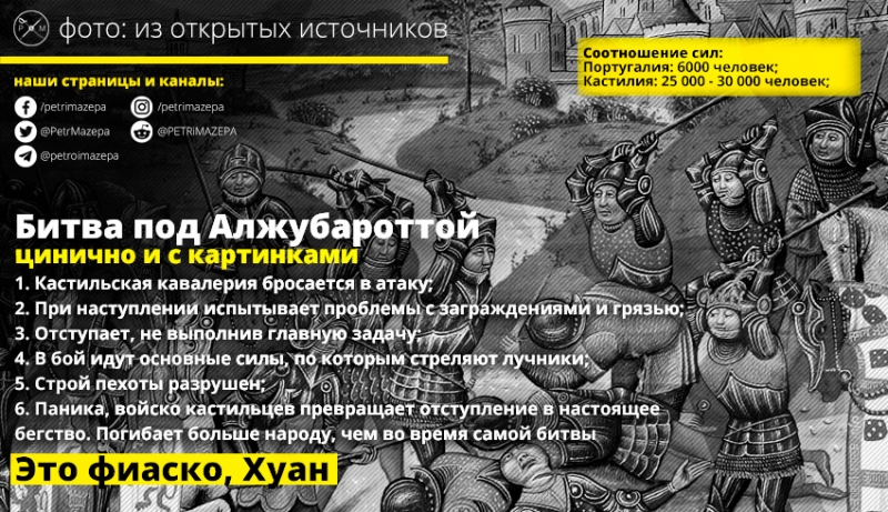 Можно лишь представить, как гордая и сильная Кастилия материлась, не сумев покорить обезглавленную Португалию. Более того, новый король успел переманить на свою сторону важного западного партнёра, за компанию с которым добил армию агрессора при полном дисбалансе сил. Ничего не напоминает?