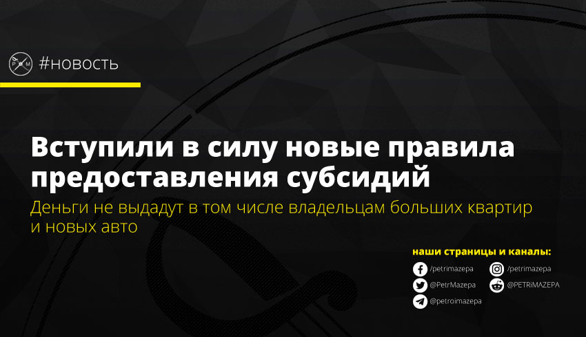 С 1 октября вступило в силу постановление правительства № 807, изменяющее механизм предоставления субсидий. По новым правилам, субсидии не будут начисляться на большие квартиры и дома, владельцам новых автомобилей и мотоциклов, должникам по алиментам и некоторым другим категориям лиц.