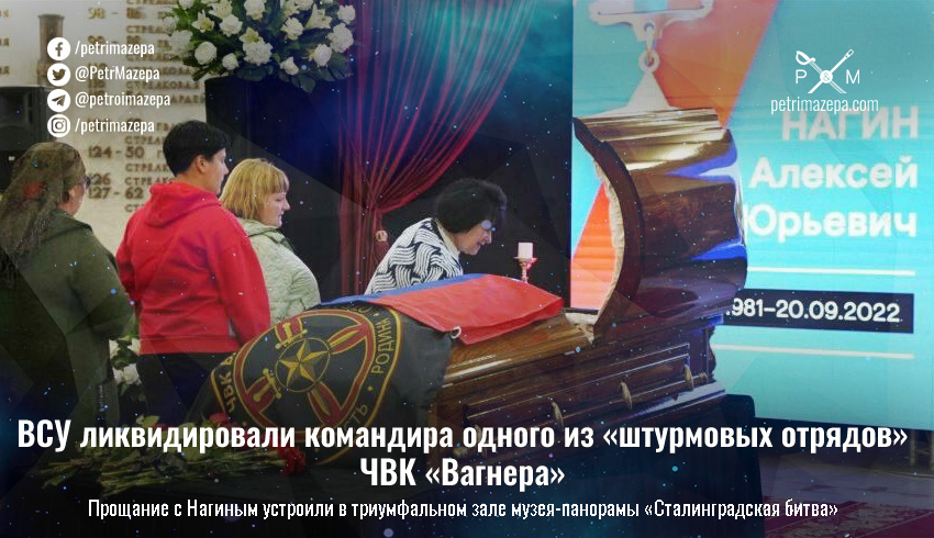 20 сентября украинские защитники очень точно попали в непростого оккупанта Алексея Нагина. Он командовал одним из штурмовых отрядов ЧВК «Вагнера». И не «зковских» последних наборов, а раннего. Начинал воевать еще в Чечне и Грузии. Поэтому похороны происходили с помпой, а прощание устроили в триумфальном зале музея-панорамы «Сталинградская битва» города Волгоград.
