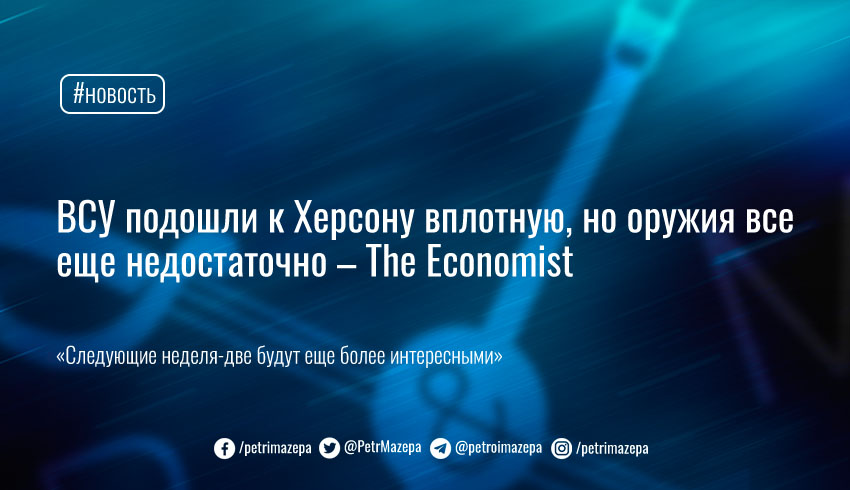 Вооруженные силы Украины вплотную подошли к пригородам Херсона, сообщает The Economist со ссылкой на свои источники — и хотя оружия все еще недостаточно, источники издания обещают нам «еще более интересные» пару недель.