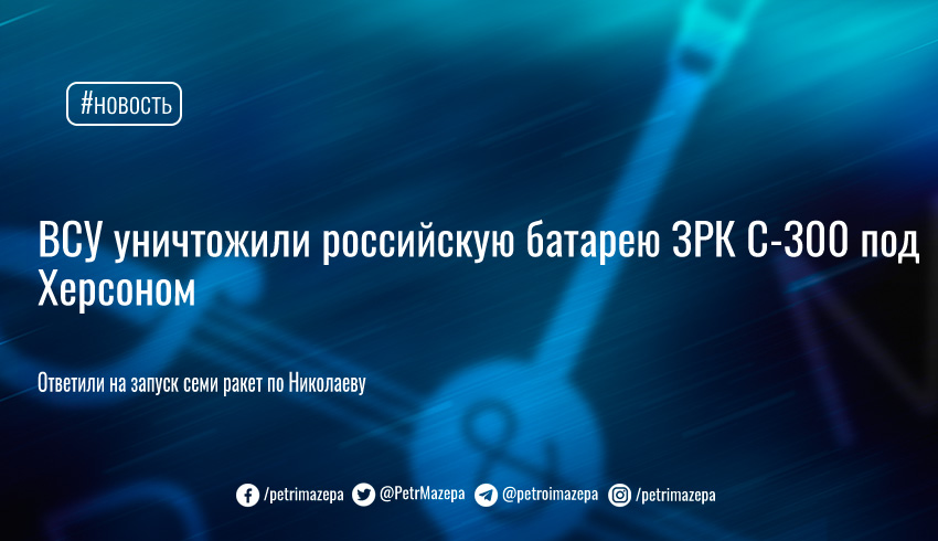 В сводке оперативного командования «Юг» значится, что россияне выпустили семь ракет из С-300 по Николаеву. «В ответ нашими ракетно-артиллерийскими подразделениями в ходе выполнения огневых задач уничтожена батарея ЗРК С-300 в районе Зеленотропинского (Голопристанский район Херсонской области — ред.). Также под огневой контроль взяты несколько объектов транспортной инфраструктуры на временно оккупированной территории, что существенно ограничивает маневренность и логистику вражеских войск», — отметил Назаров.