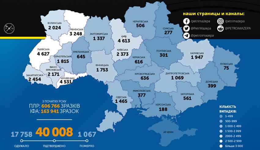 Всего подтверждено 40008 случаев COVID-19, из них 17 758 выздоровели (+349 за последние сутки), умерли - 1067 (+16). За последние сутки лабораторно подтверждено 994 случая. Всего проведенных исследований в Украине методом ПЦР – 606766 (+13015), методом ИФА – 163941 (+10890).