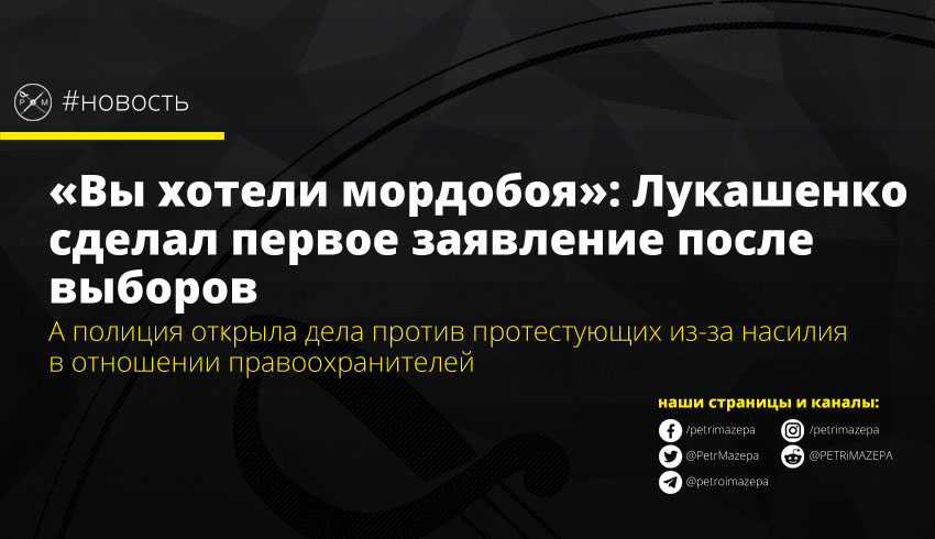 Президент Беларуси Александр Лукашенко сделал первое заявление после выборов – он отметил, что готов к диалогу с оппонентами, но они должны вести себя по закону, а они «хотели мордобоя», из-за чего «мы вас поставили на место». А глава Следственного комитета Беларуси отметил, что уже открыты дела касательно массовых беспорядков и насилия в отношении правоохранителей.