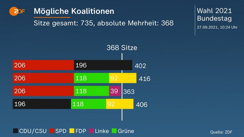Журналист Роман Шрайк опубликовал в Telegram диаграммы с предварительными итогами выборов в Германии и вариантами коалиции (368 мест составляют большинство).