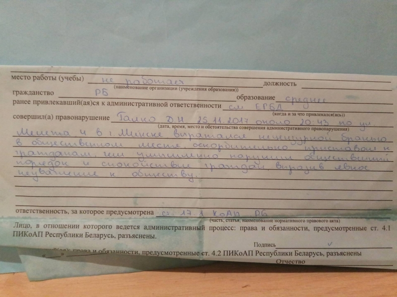 В итоге Яна допрашивали всю ночь. Отпустили только к пяти утра. Понятное дело, что это незаконно — допрашивать ночью, тем более несовершеннолетнего. Равно как и применять к нему спецсредства. Я сижу всю ночь в «стакане». На меня не составляется ни один протокол. Нахожусь в непонятках. Там же сидит какой-то человек с белой горячкой, который пытается меня душить, и задержанный за покушение на убийство. Только рано утром заходит милиционер и даёт мне некий документ без подписей, в котором написано, что я обвиняюсь по статье 17-1 КоАП Беларуси. По их версии, я в трезвом виде на улице оскорблял прохожих. Согласно документу — в девять часов вечера.
