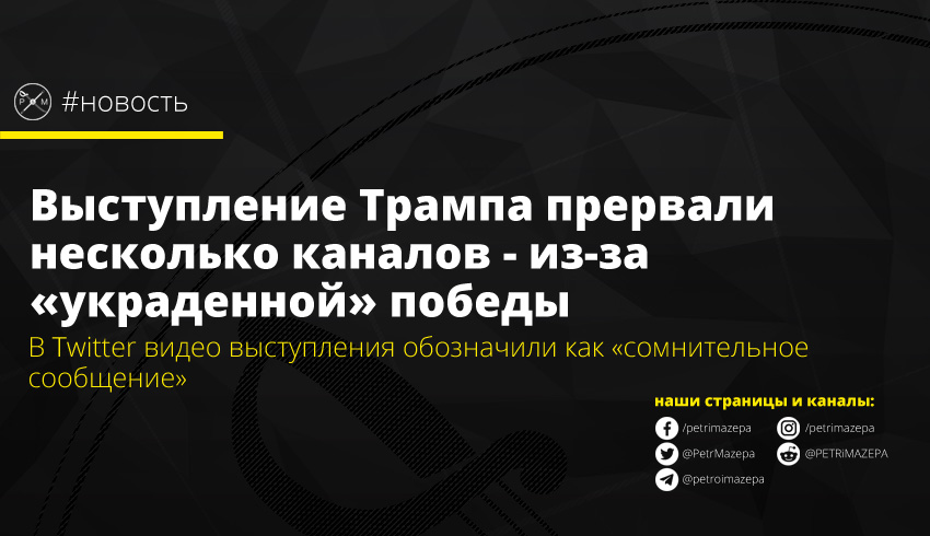 ABC, CBS и NBC прервали обращения Трампа в Белом доме, где он выдвинул обвинение в том, что выборы у него украли. Ведущие каналов заявили, что им необходимо проверить информацию, распространяемую президентом, сообщает The Verge.