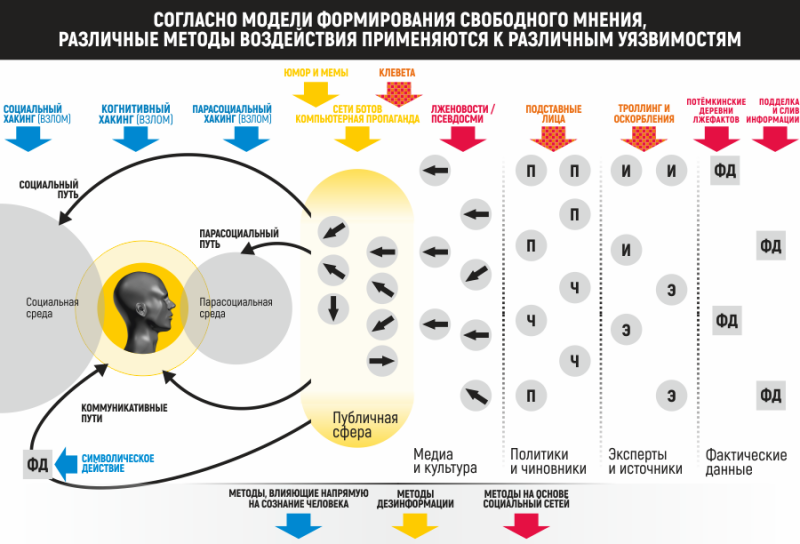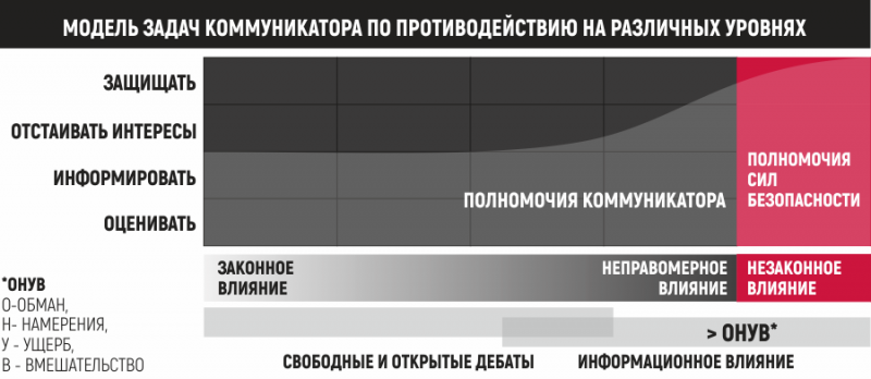 Вообще, каждая страна имеет право отстаивать свои интересы, и предложение альтернативного взгляда на происходящее не всегда делается со злым умыслом. Поэтому информационные кампании всегда располагаются где-то на следующем спектре: законное влияние, участие в открытом обсуждении — недобросовестное влияние — незаконное информационное воздействие.