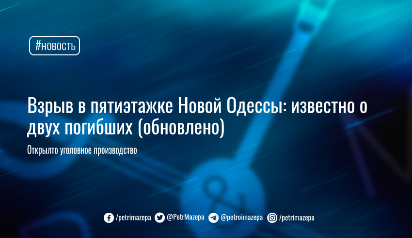 В пятиэтажке городa Новая Одесса (Николaевскaя облaсть) произошел взрыв. По предварительной информации, причиной тому стaл взрыв газа. Разрушены 2 квартиры на четвертом и 2 квартиры на пятом этажах. Из дома были эвакуированы 50 жителей. В результате инцидентa пострадали три человека, двое погибших.