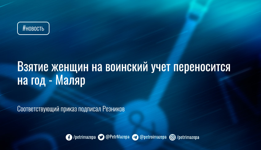 «Понимая, что законотворческий процесс длительный, параллельно Минобороны в рамках полномочий подготовило приказ, которым в очередной раз отсрочило сроки взятия женщин соответствующих профессий/специальностей на воинский учет еще на год — до 1 октября 2023 года. Соответствующий приказ вчера, 6 сентября, подписал министр Алексей Резников», — написала Маляр в Facebook.