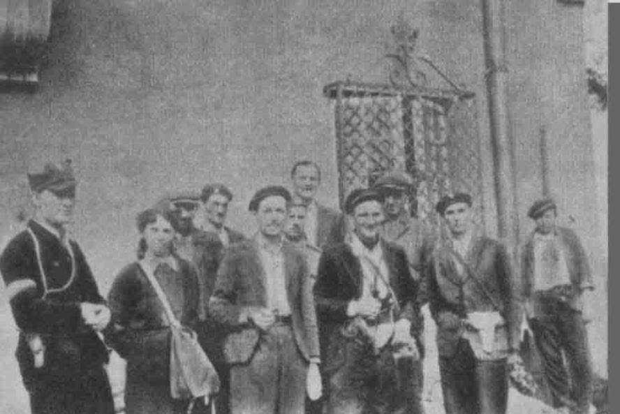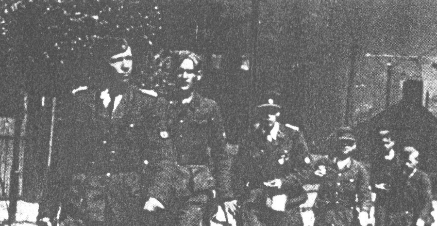 Офицеры АК в Жолибоже. Между наиболее высоким повстанцем с усами и повстанцем в берете выглядывает командир русского взвода АК, бывший лейтенант погранвойск РККА Виктор Башмаков (шестой слева)