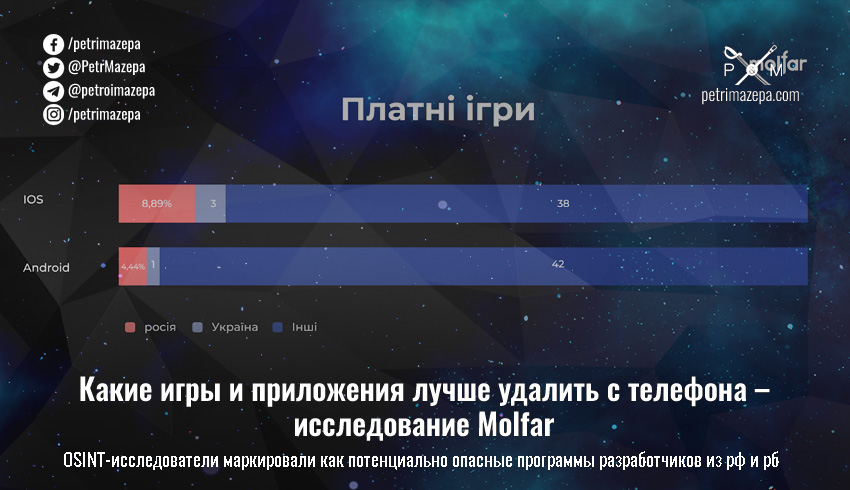 «Мы исследовали 45 лучших игр/приложений в определенной категории по украинскому региону загрузок. То есть, "лучшие" приложения были автоматически сформированы платформой Google Play при анализе Android-приложений и платформой AppStore при анализе iOS-приложений автоматически на 1 декабря 2022 года по региону Ukraine», — уточняют в Molfar.