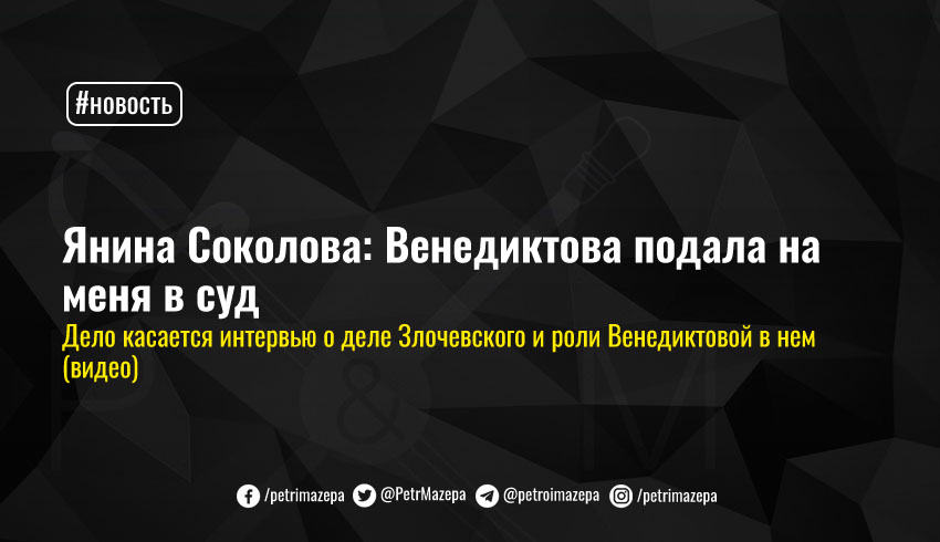 Журналистка Янина Соколова сообщила, что генпрокурор Ирина Венедиктова подала на нее в суд. Иск касается интервью внештатного агента НАБУ и разоблачителя в деле о наибольшей в истории Украины взятки Евгения Шевченко, где он рассказывает о желании Венедиктовой «загасить» дело экс-министра Злочевского.