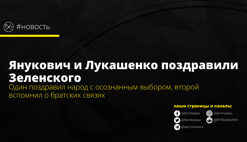 Свои поздравления победителю президентских выборов Владимиру Зеленскому принесли президент Беларуси Александр Лукашенко и одиозный экс-президент Украины Виктор Янукович, осужденный за госизмену. Лидер соседнего государства напомнил про закаленные совместной историей братские связи, а Янукович поздравил народ с «осознанным выбором», обвинил Порошенко в «чудовищных страданиях», и назвал главной задачей Зеленского «принести стране мир».