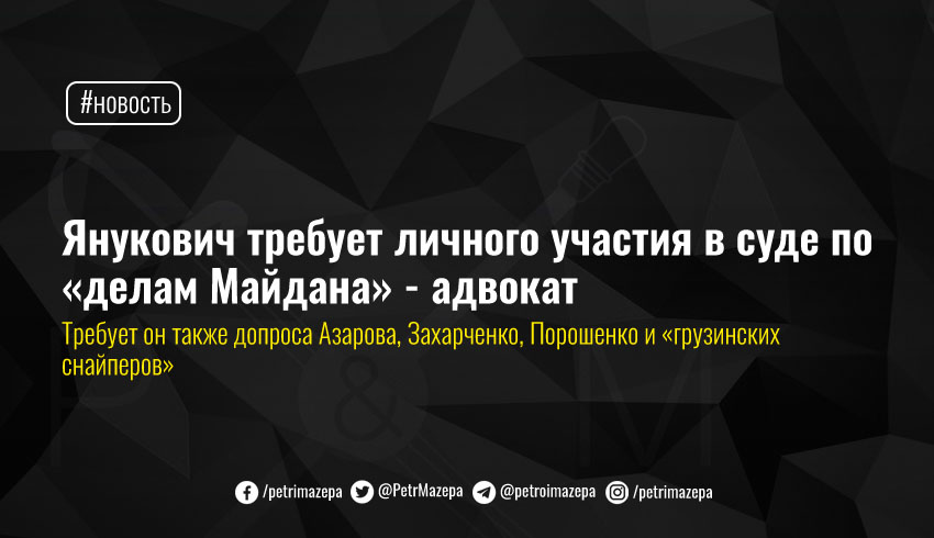 Бывший президент Виктор Янукович требует личного участия в суде по «делам Майдана», где ему будет избираться мера пресечения. Также он и его защита требуют допроса свидетелей, в том числе Николая Азарова, Виталия Захарченко и пятого президента Украины Петра Порошенко.