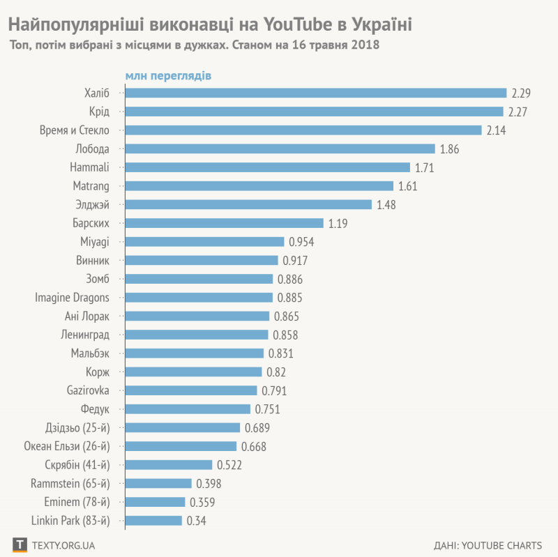 Сервис YouTube с 10 мая расширил свои музыкальные чарты на 44 страны, в число которых вошла и Украина. Тексти.org.ua сделали инфографику о том, какие песни и исполнителей предпочитает украинский пользователь YouTube. Там все печально. Только Винник замыкает топ-10.