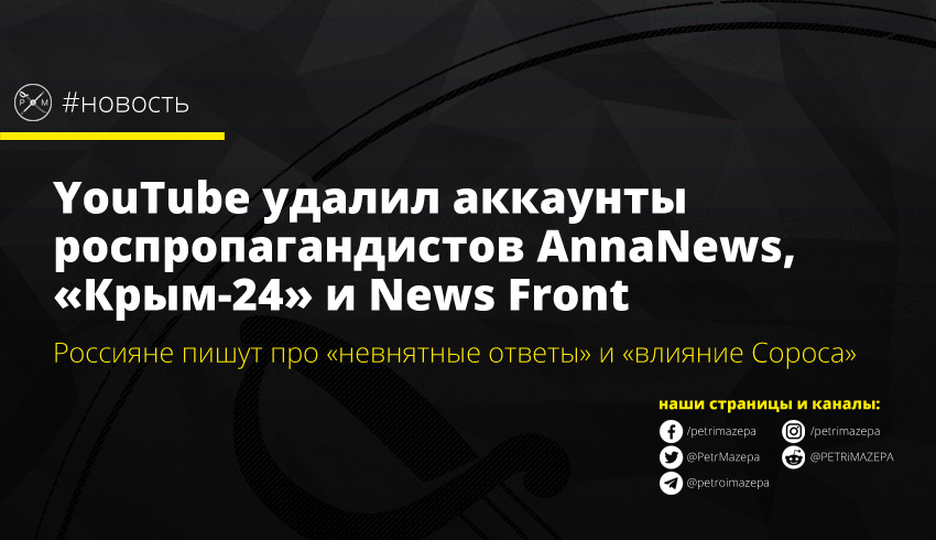 Сегодня видеохостинг YouTube удалил аккаунты, распространяющие пророссийскую пропаганду. YouTube избавился от «телеканала "Крым-24"», а также «информагентств» AnnaNews и News Front. Представители администрации AnnaNews говорят про отсутствие причин для блокировки, а пророссийские рупоры соцсетей, типа Colonel Cassad, пишут про влияние Сороса на это решение.