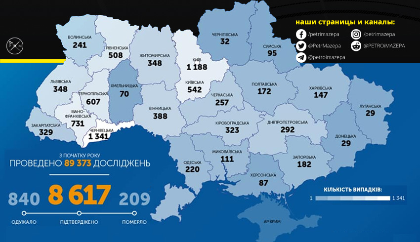 Всего в Украине исследовано 89 373 образцы методом ПЦР. В результате осложнений, вызванных болезнью, умерли 209. Среди умерших преобладают лица в возрасте от 50 лет (86%). В общем 840 пациентов уже выздоровели, из них 162 медики, - повторное лабораторное исследование не выявило вируса в организме.