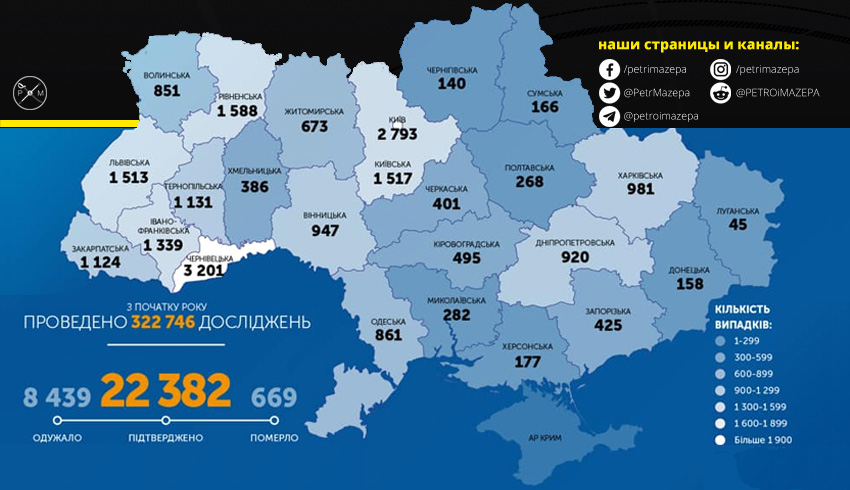 Всего в Украине подтверждено 22382 случая COVID-19, из них 8439 выздоровели (+444 за последние сутки), 669 умерли (+11). За последние сутки лабораторно подтверждено 477 случаев. Всего в Украине исследовано 322 746 образцов методом ПЦР, в том числе – 10 298 за последние сутки.