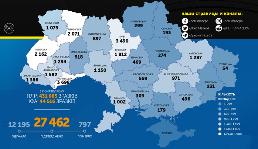 Всего в Украине подтверждено 27462 случаи COVID-19, из них 12 195 выздоровели (+141 за последние сутки), 797 умерли (+9). За последние сутки лабораторно подтверждено 463 случая. Всего в Украине исследовано 431 085 образцов методом ПЦР (+6569) и 44516 образцов - методом ИФА (+1078).