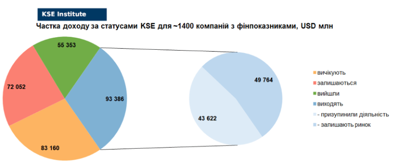 В пересчете на доходы распределение выходит следующее: компании из 18% совокупного дохода вышли, из 31% от общего дохода выходят, из 24% от общего дохода остаются, и 27% дохода — выжидают.