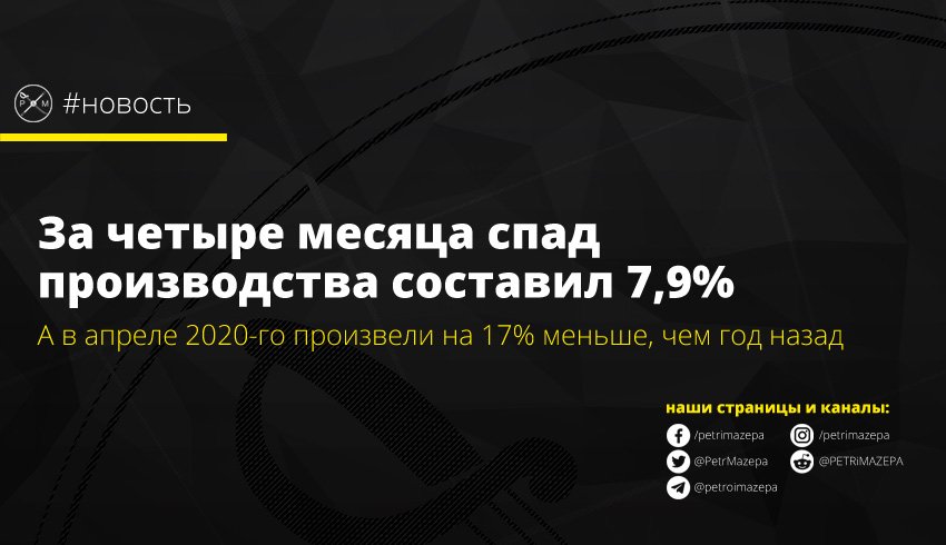 Кроме того, в Госстате показали статистику за четыре месяца 2020 года. В январе–апреле 2020 года по сравнению с январем–апрелем 2019 года индекс промышленной продукции составил 92,1%, в т. ч. в добывающей промышленности и разработке карьеров – 94,0%, перерабатывающей – 91,3%, поставке электроэнергии, газа, пара и кондиционированного воздуха – 92,0%.
