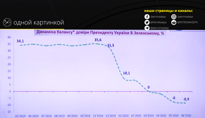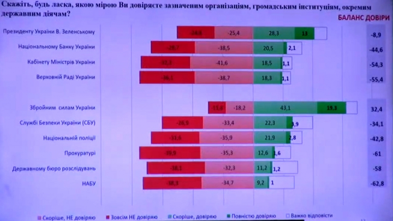 Согласно результатам опроса Украинского института социальных исследований им. А.Яременко баланс доверия у президента Украины Владимира Зеленского за год с позитивного +34,1% опустился до негативного -8,9%. Большая часть госструктур и госорганизаций имеют еще больший кризис доверия со стороны украинцев. В то же время негосударственные объединения зачастую имеют позитивный баланс одобрения.