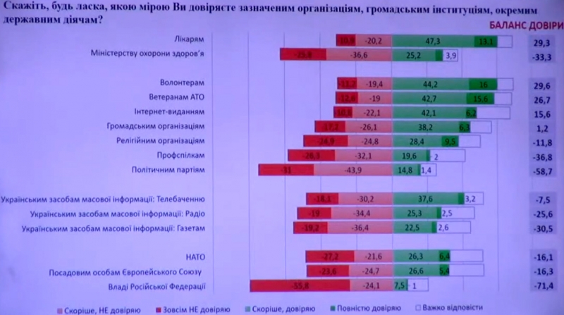 Из госструктур баланс доверия позитивен только у Вооруженных сил Украины (ВСУ) и составляет 32,4%. Также положительный баланс у ветеранов АТО, волонтеров, интернет-изданий и общественных организаций.